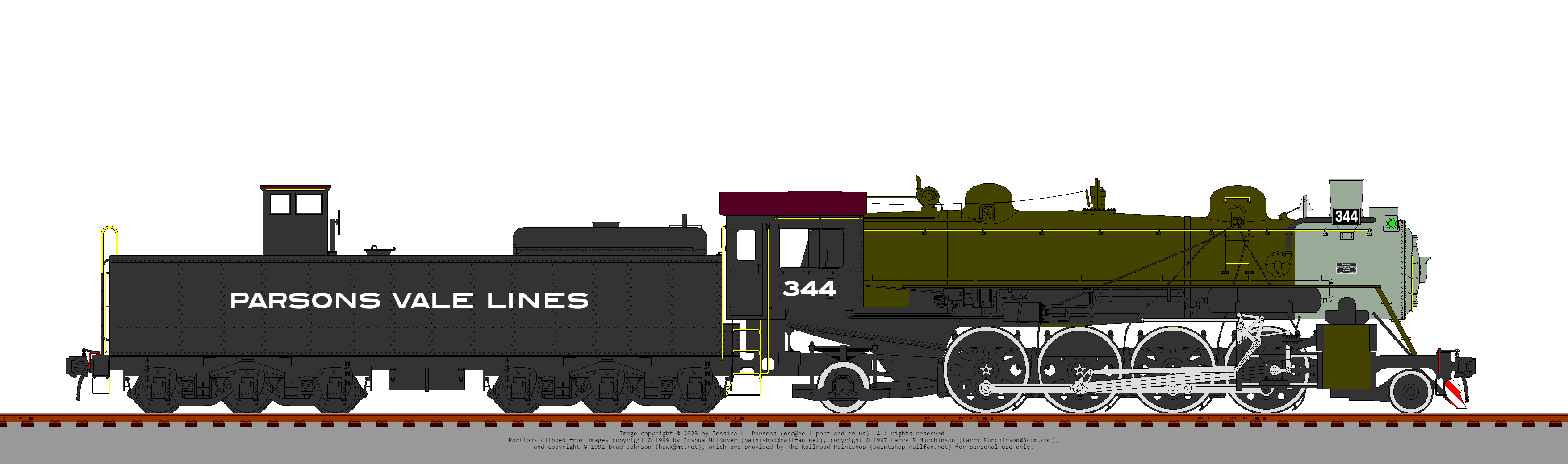 When ordered, 344 came with a short 8-wheel tender, but as the Parsons Vale system expanded and some of the excursions became more ambitious, its tender had a section spliced into the middle to increase its water capacity, plus had the original freight trucks under it replaced with 3-axle passenger trucks (from a recently retired MOW coach) to keep the axle loading down (the vastly improved ride was lagniappe and was greatly appreciated on the rare occasions when the brakeman rode in the doghouse rather than the fairly cramped cab.)